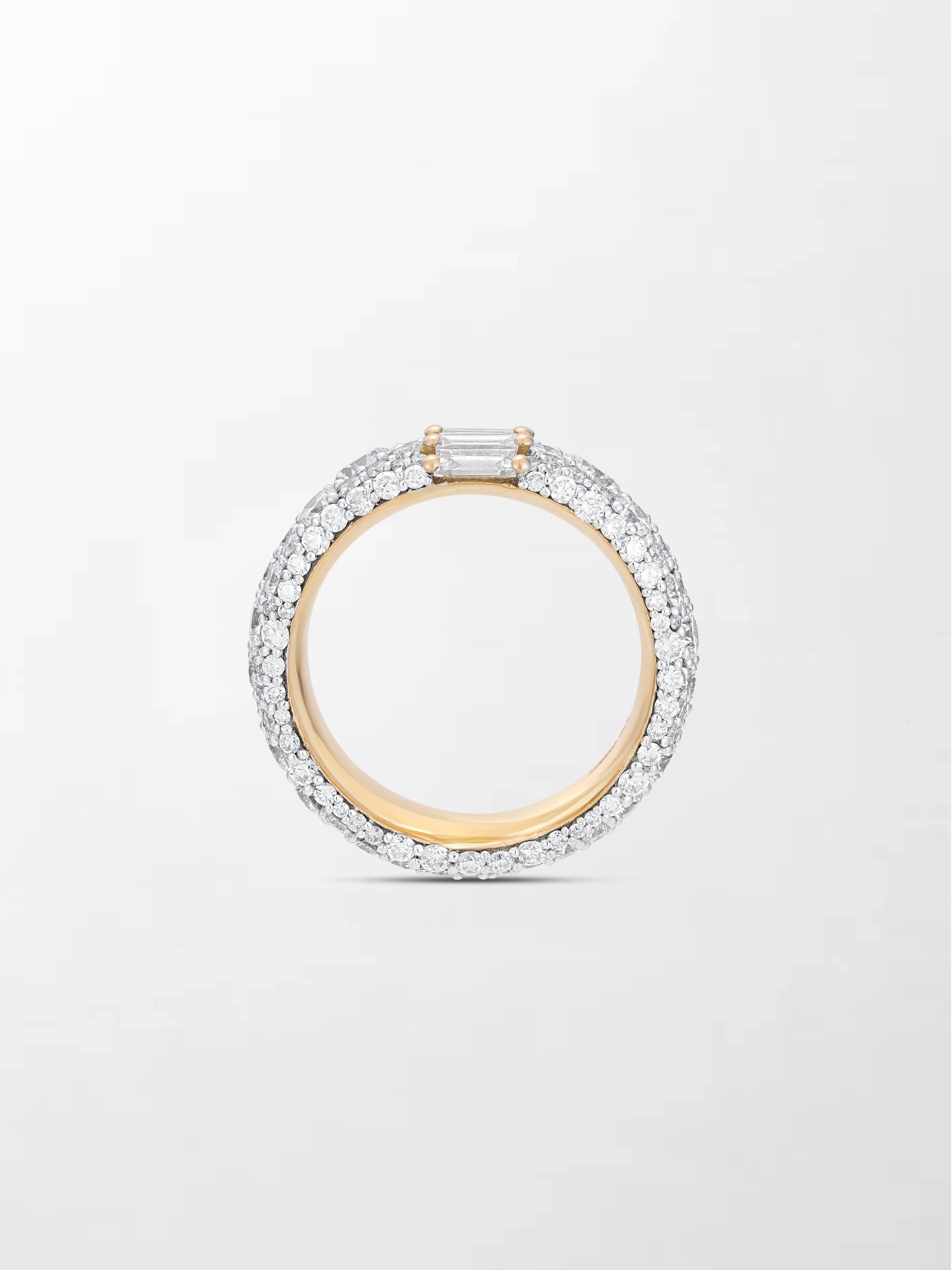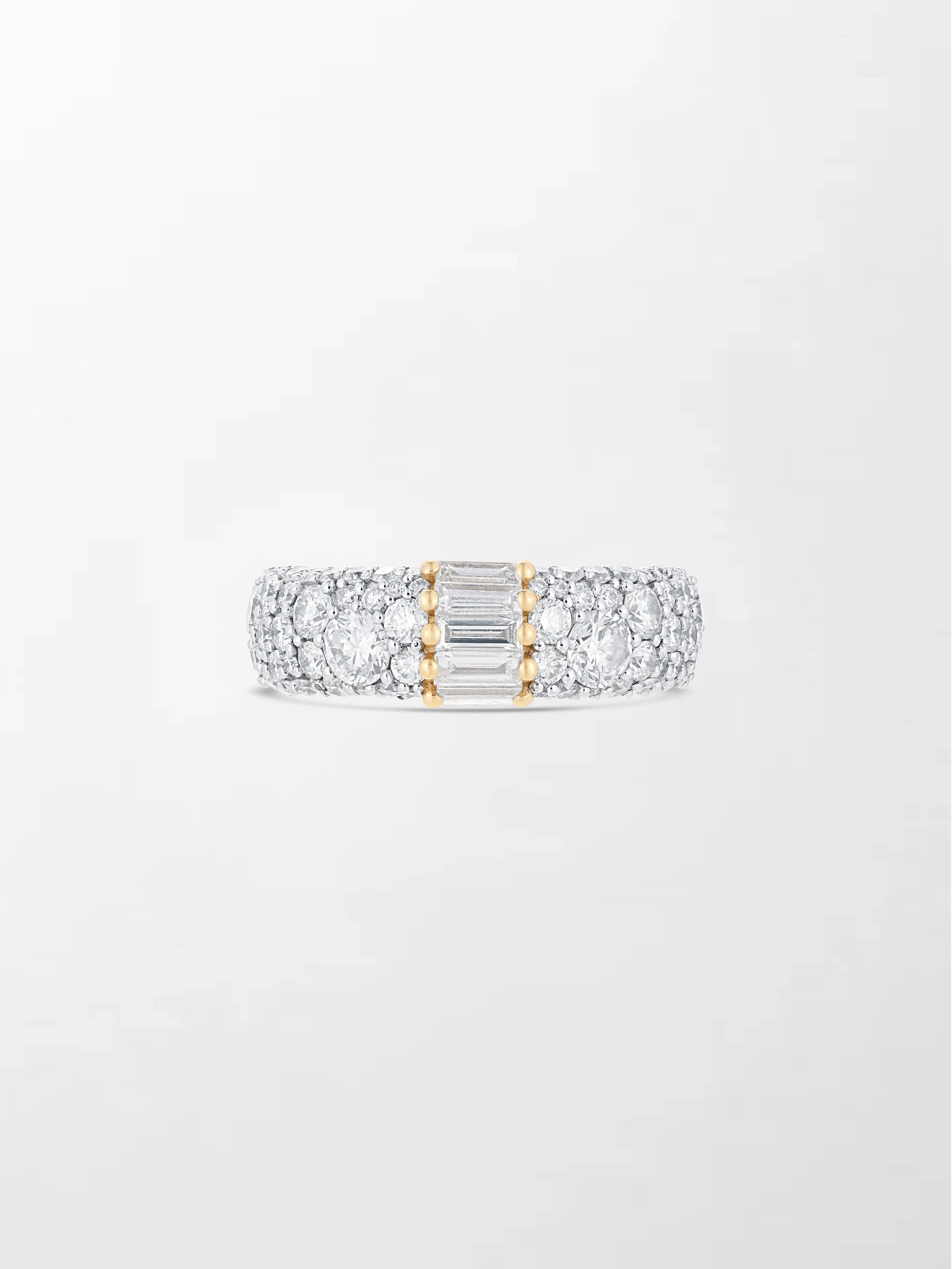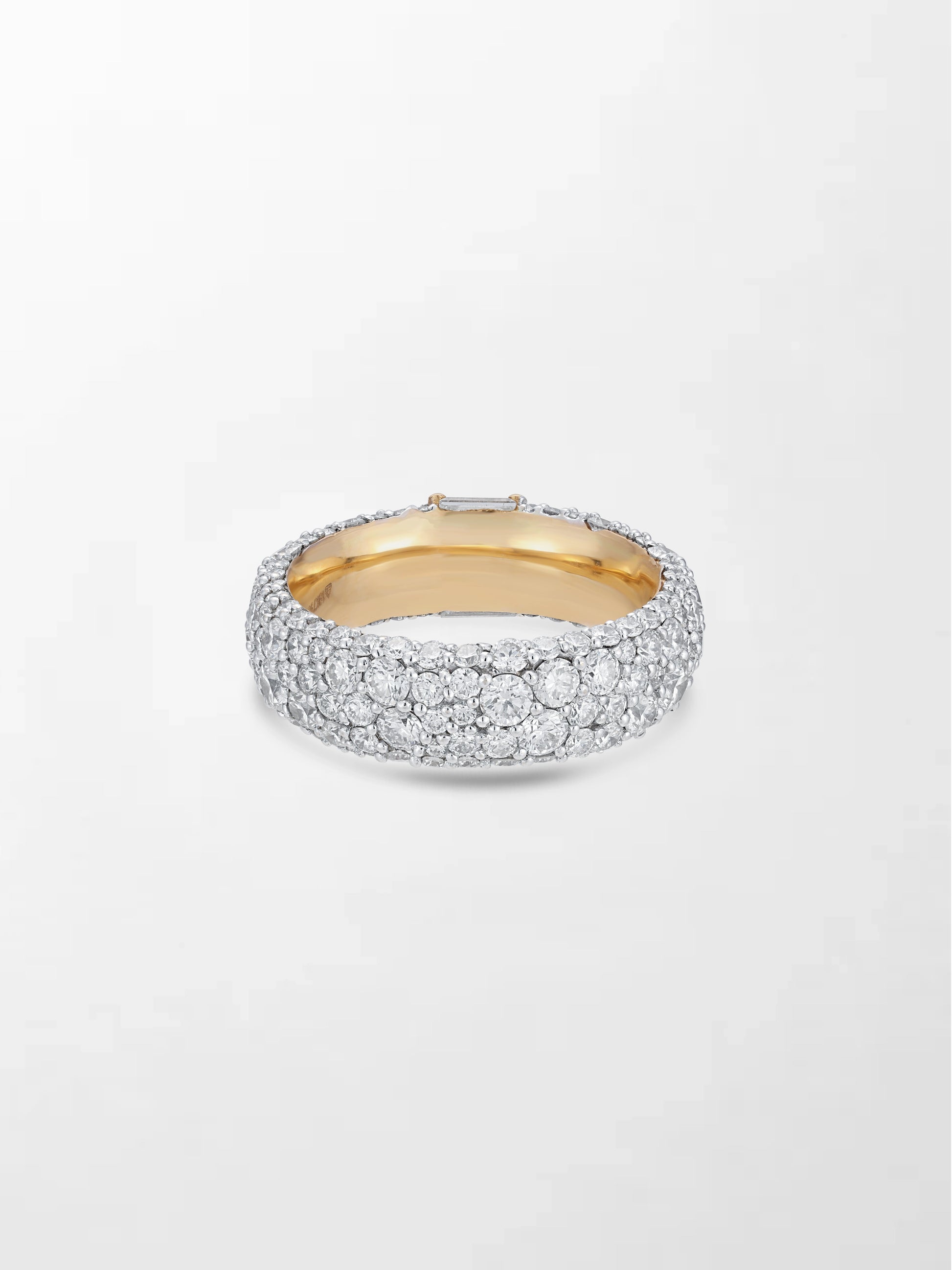 A stunning statement of elegance, this band features 110 brilliant round natural diamonds encircling the band, with 5 baguette cut natural diamonds at the center, all set in 18K yellow gold for a radiant, timeless sparkle.