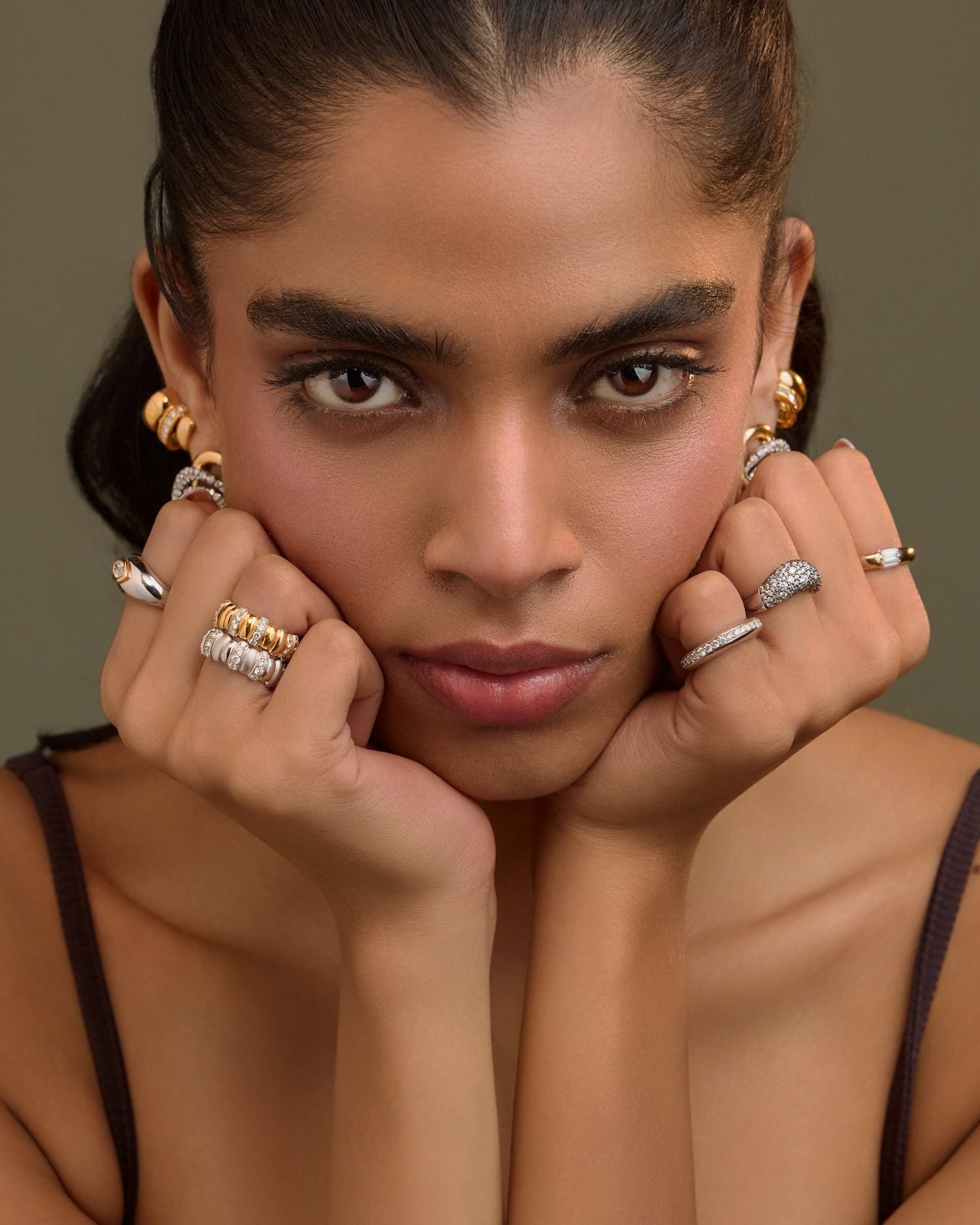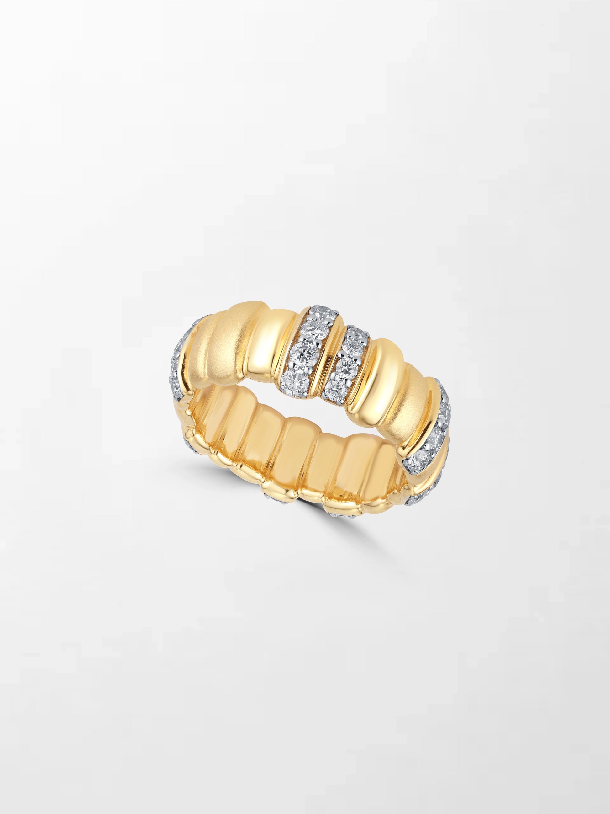 Diamonds catch the light along a sleek, grooved path. 32 stones set in 18K yellow gold create a rhythm of sparkle that’s subtle yet unforgettable.