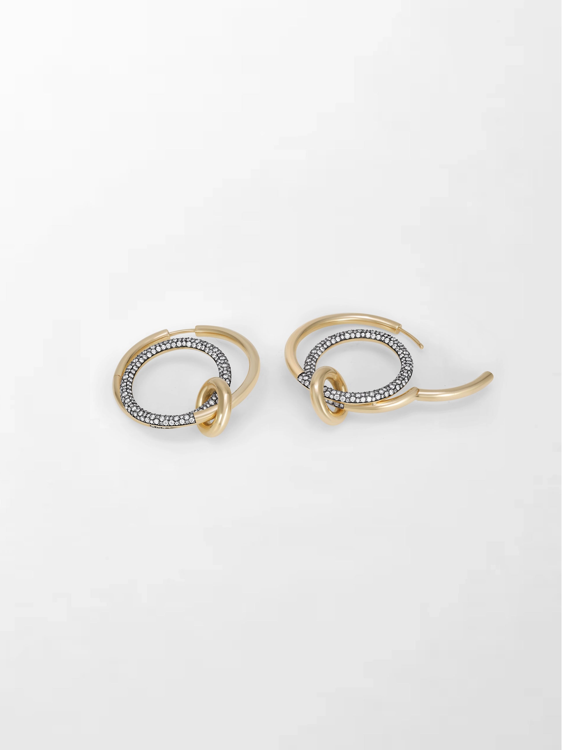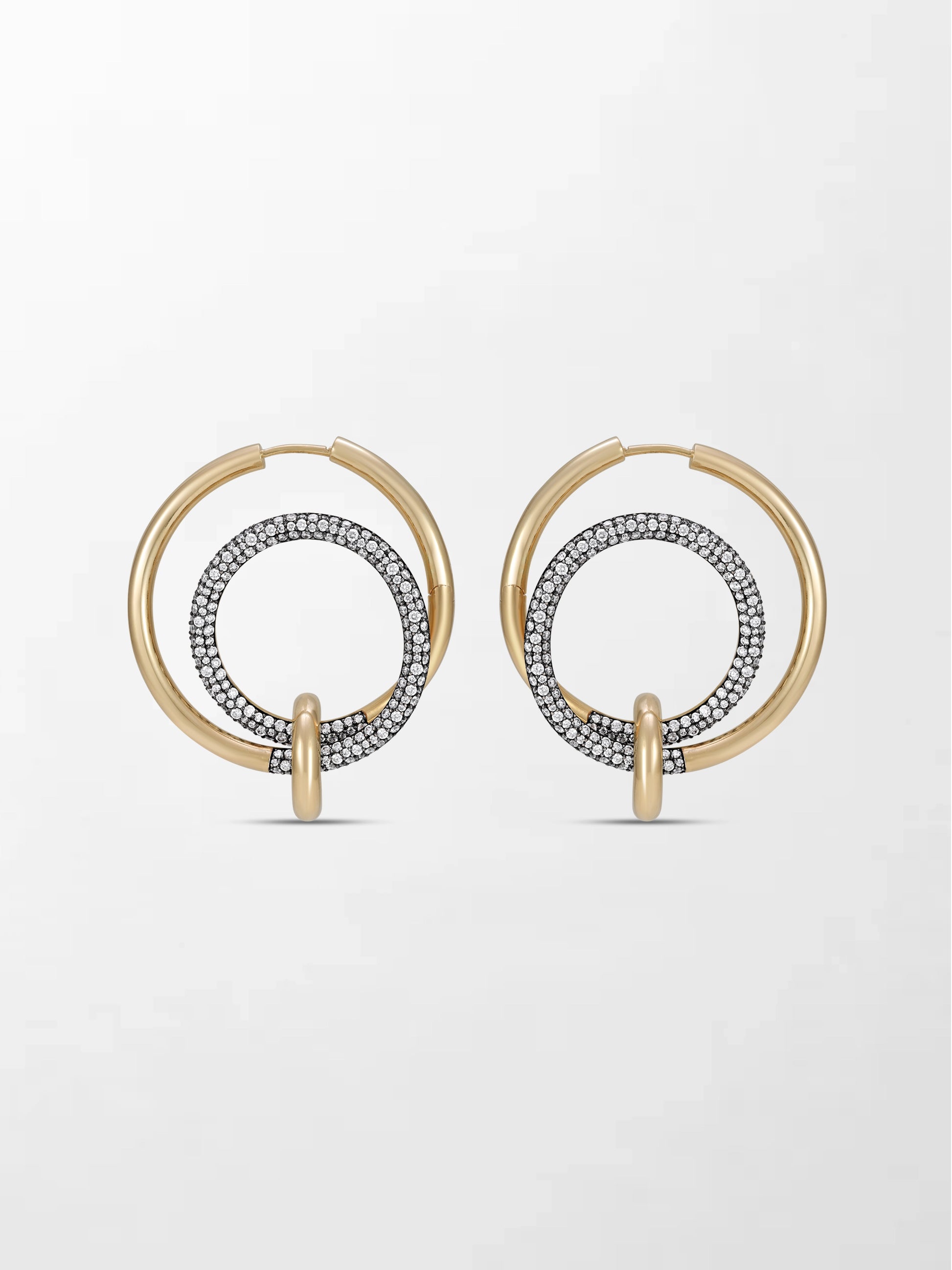 Daring and dynamic, these 14K yellow gold hoops sparkle with 426 diamonds, featuring a floating curved drop wrapped in black rhodium for a striking, modern edge.