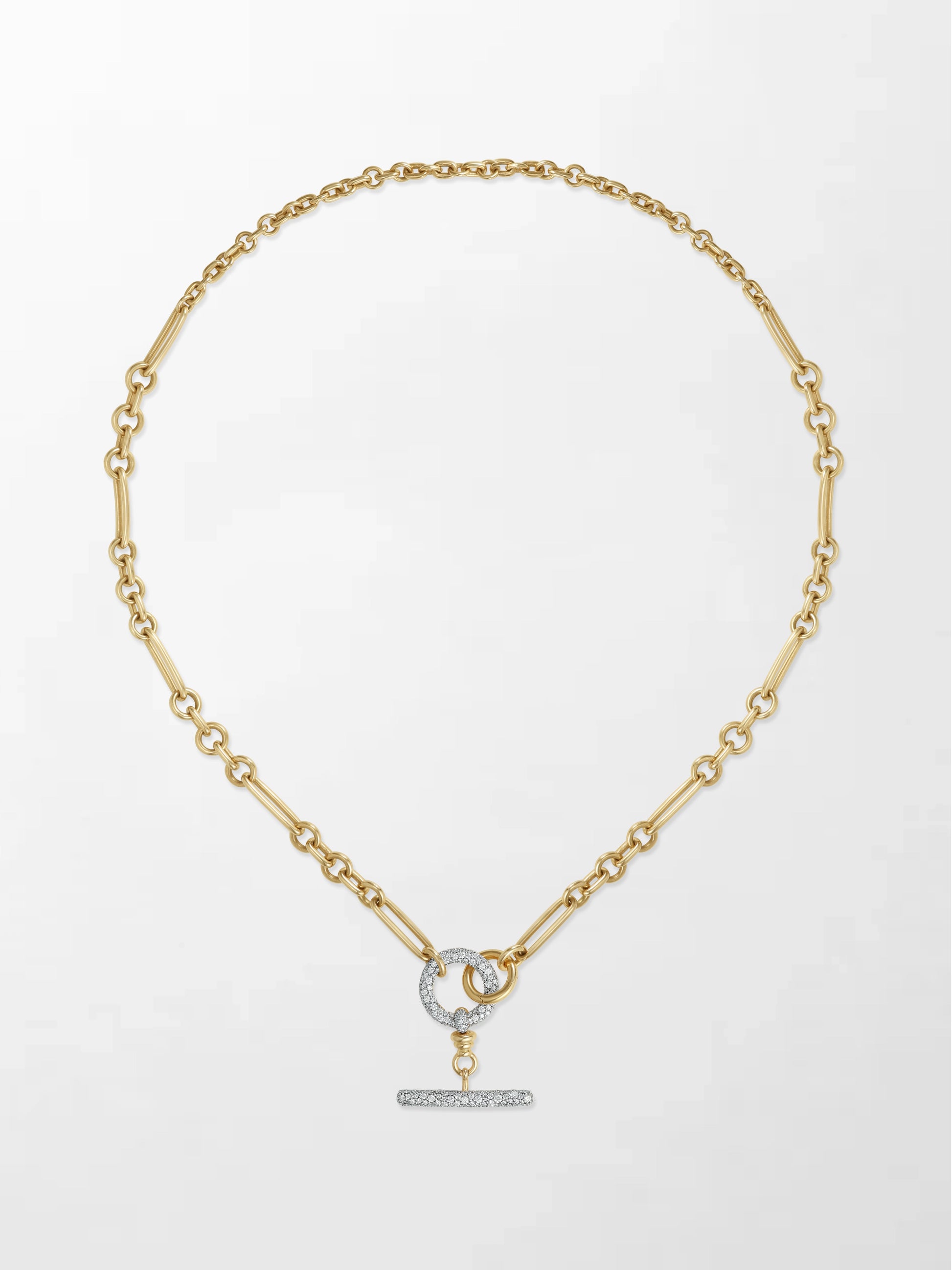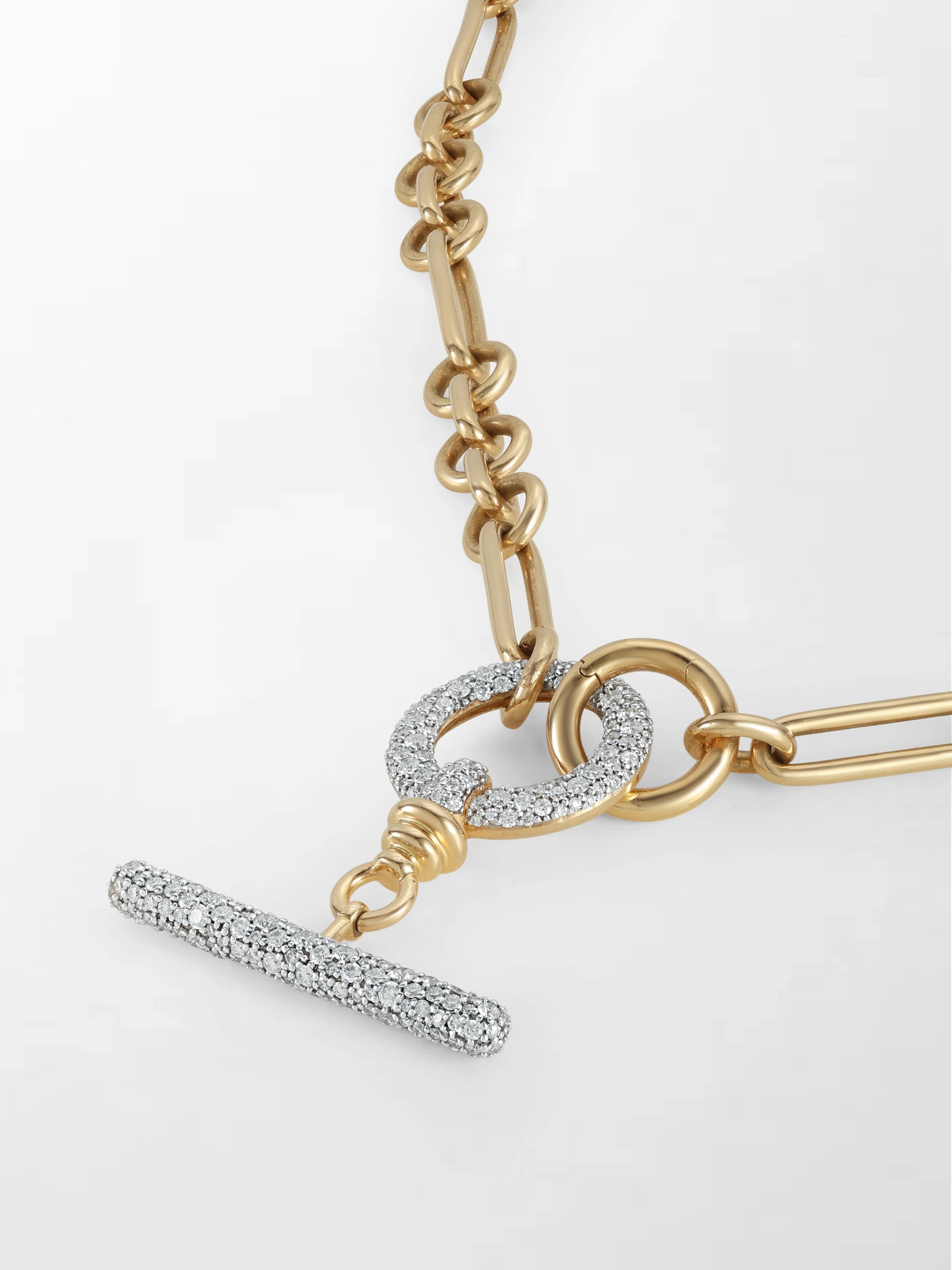The Link T-Bar Bracelet features 268 natural round diamonds set in 14K yellow gold, with a chain of diamond-accented links and a fully diamond-encrusted T-bar closure