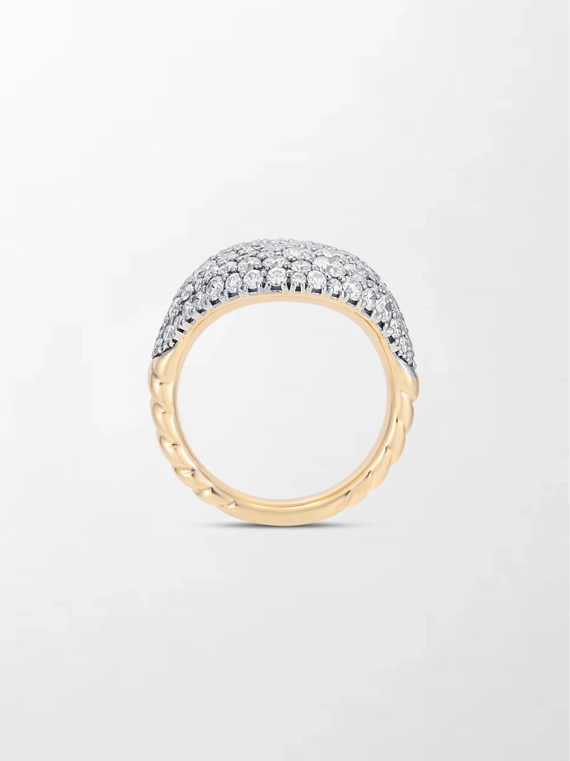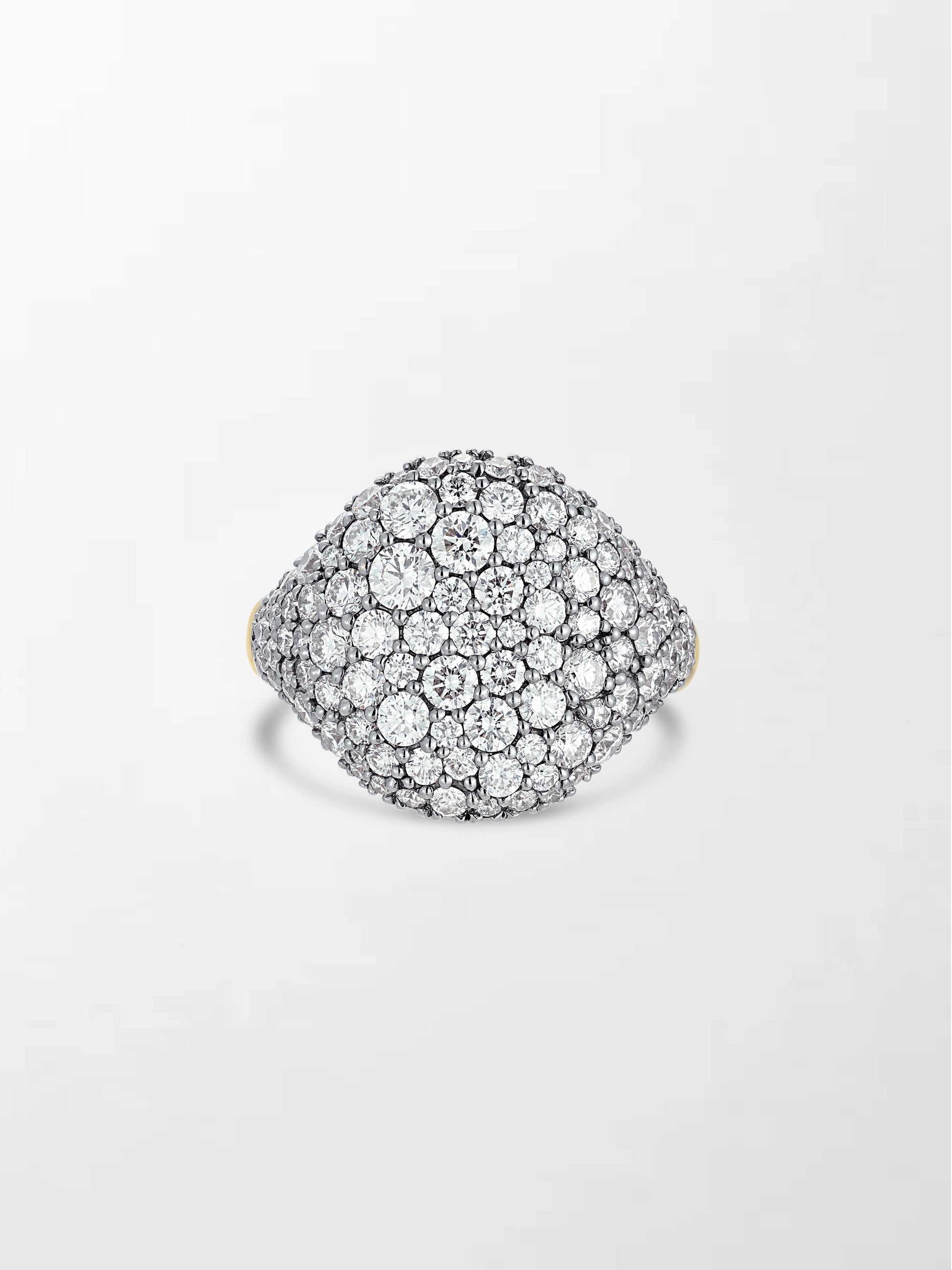 This 18K yellow gold ring with 180 round diamonds features a black rhodium finish, offering a bold, modern twist on classic luxury.