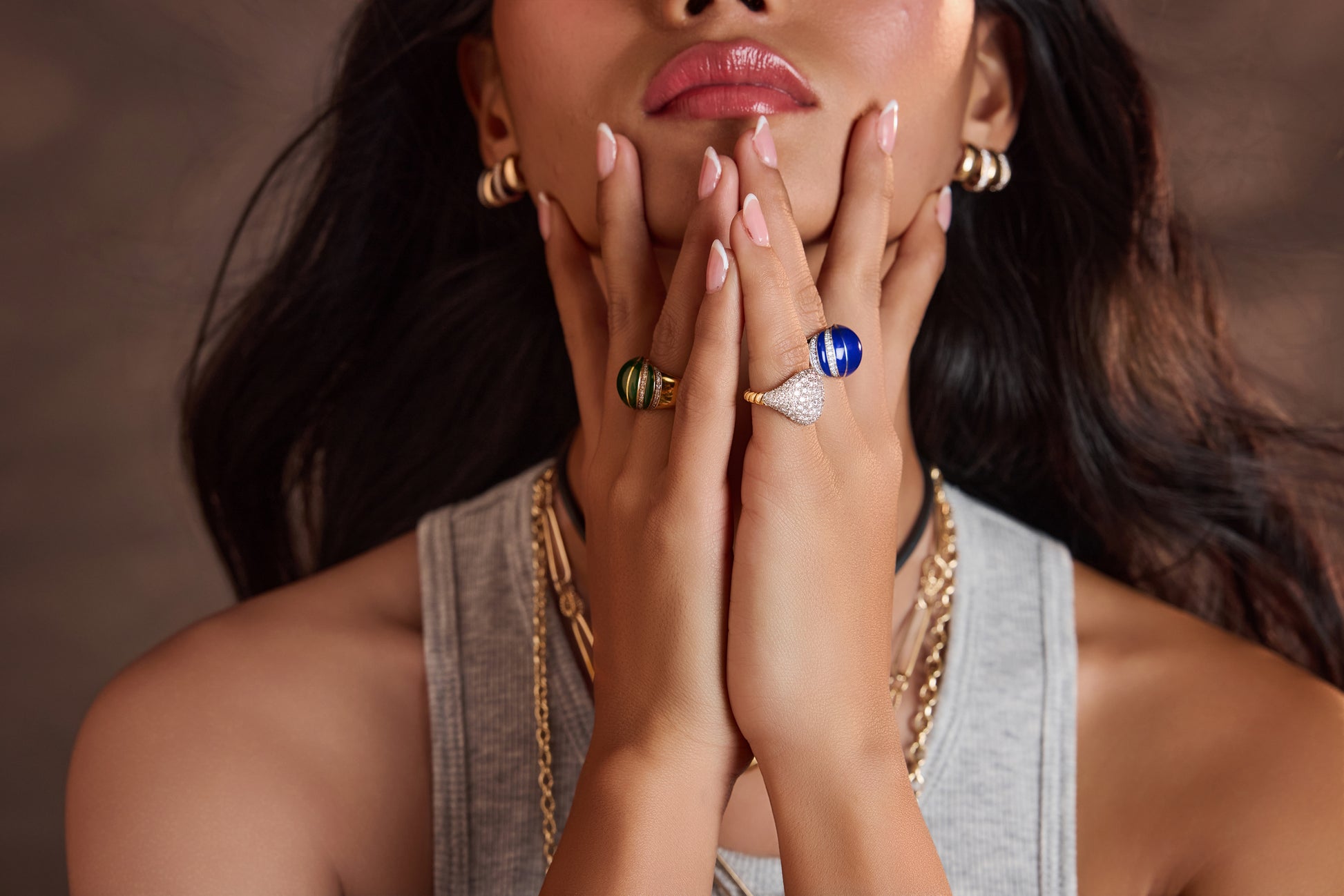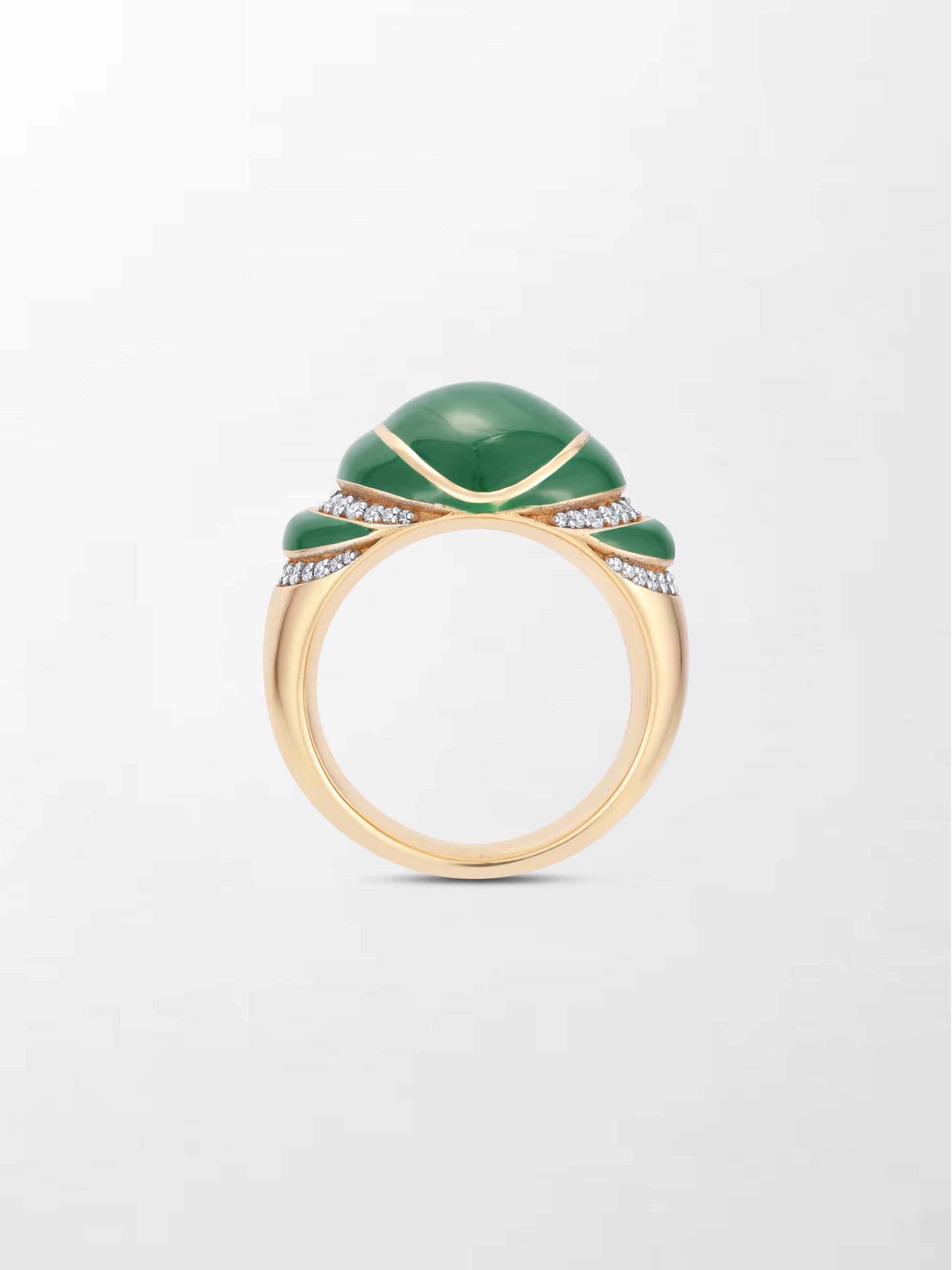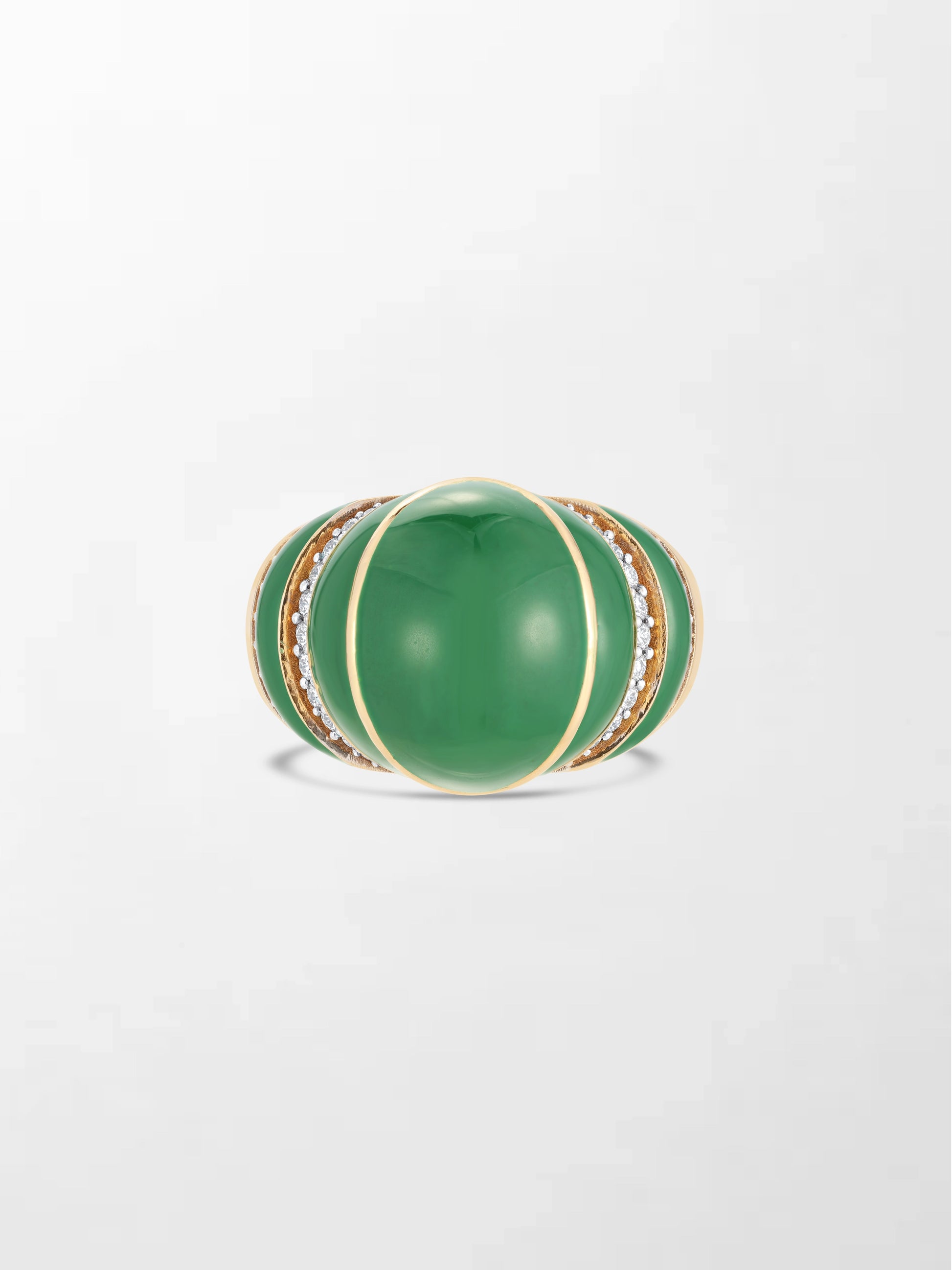 Emerald light meets golden warmth. 52 diamonds shimmer around a vivid green enamel, creating a ring that’s playful, radiant, and full of life.