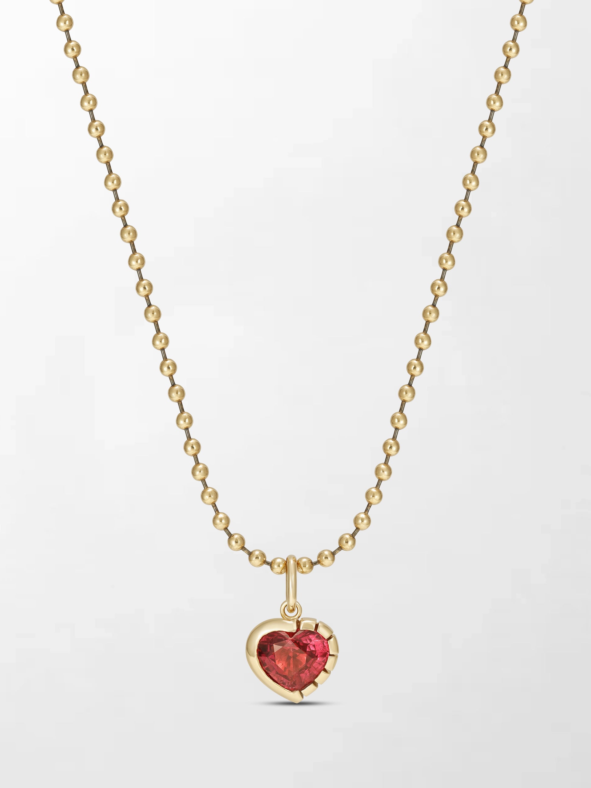 Crafted in 18K yellow gold, this pendant features a single rubylite set in a refined split bezel design, offering a sleek pop of color with a modern finish. with ball chain that has black rhodium. The openable loop makes it easy to style on any chain or wear layered.