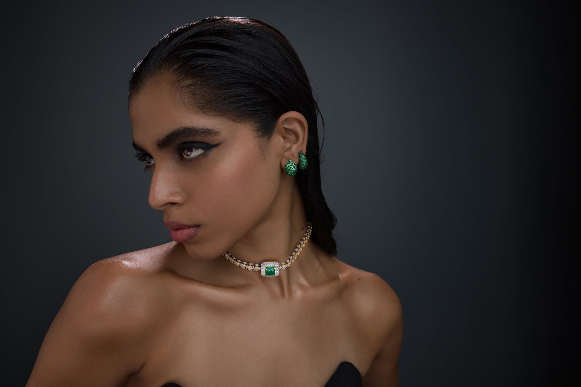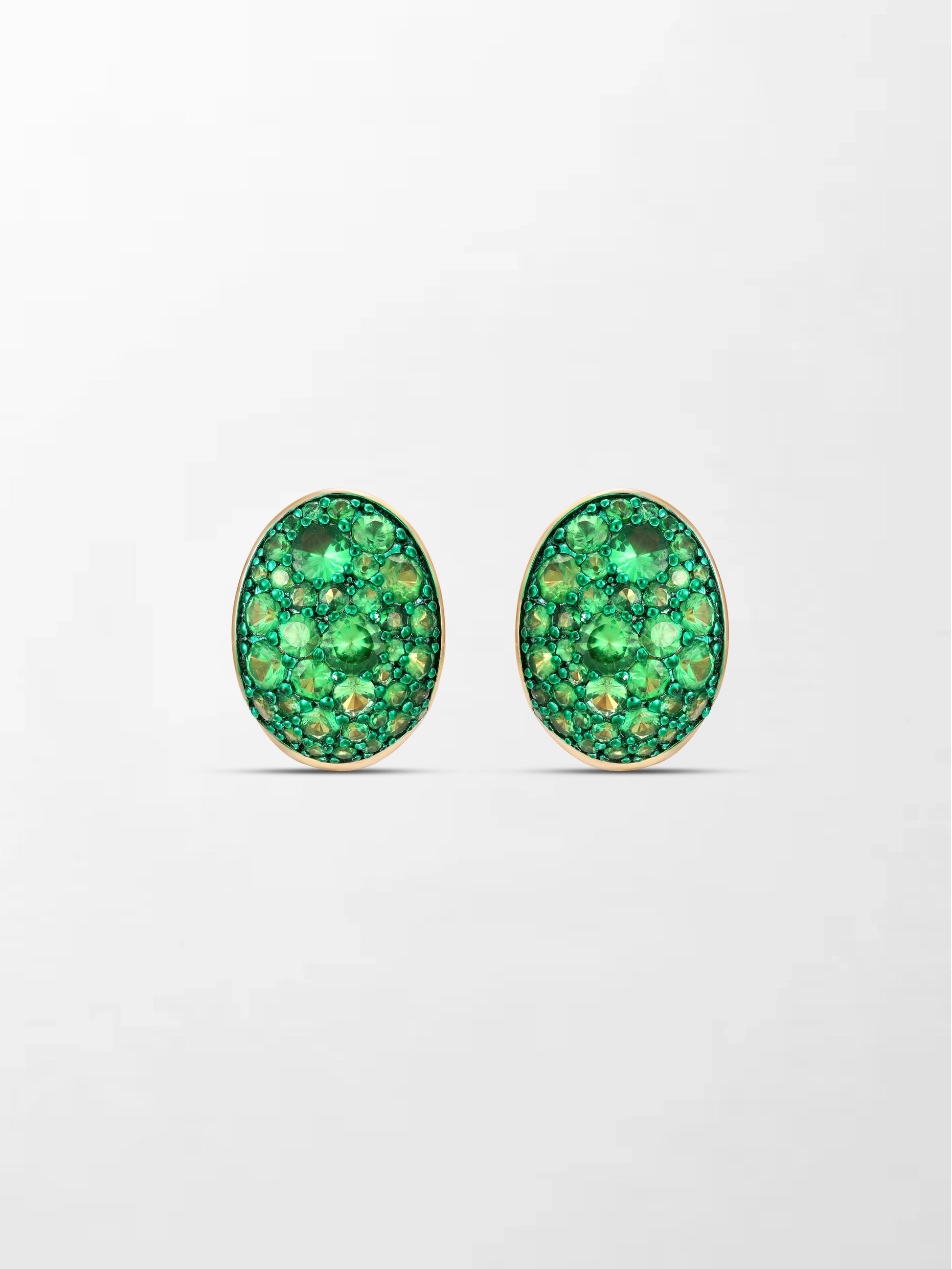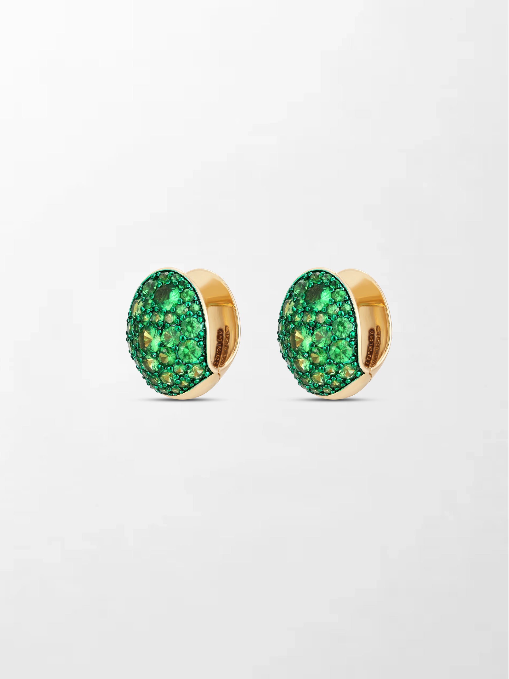 A vibrant display of elegance, these 18K yellow gold huggies are set with 74 tsavorites of varying sizes, gracefully curving to create a dynamic, contemporary silhouette that celebrates color and form.